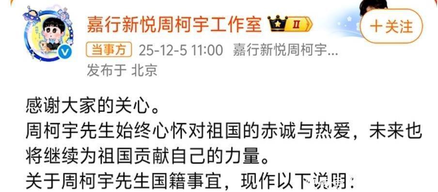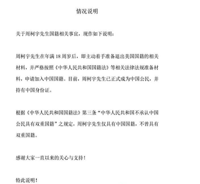 声明里提到,周柯宇刚满18岁那会儿,就已经开始着手办理退出美国国籍的手续了。到现在为止,周柯宇已经是中国公民了,还拿到了中国的身份证。